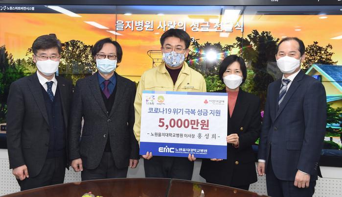 서울 노원구는 최근 을지대학교 을지병원으로부터 코로나19 위기 극복을 위한 성금 5000만원을 전달받았다. 이날 을지대학교병원 이사장, 원장 등이 참석해 성금을 기탁했다. 사진은 오승록 구청장(가운데)과 관계자들이 기념촬영을 하는 모습. (사진제공=노원구청)