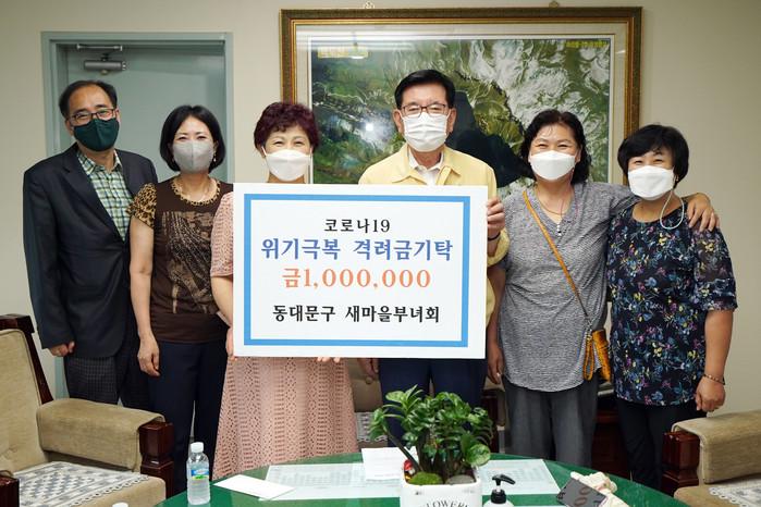 서울 동대문구는 23일 새마을부녀회로부터 코로나19 대응으로 고군분투하는 동대문구 직원들을 위한 격려금 100만원을 기탁받았다. 사진은 전달식에서 유덕열 구청장(오른쪽에서 세 번째)과 관계자들이 기념촬영을 하는 모습. (사진제공=동대문구청)