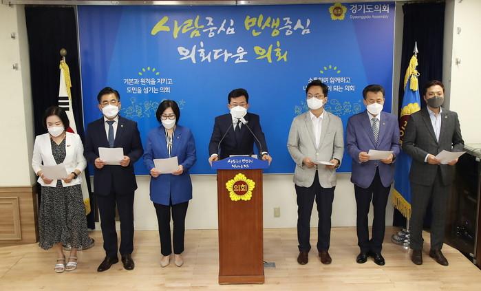 경기도의회 더불어민주당이 9일 모든 도민에게 재난지원금을 지급해줄 것을 경기도에 공식 요청했다. 도의회 더불어민주당 의원들은 정부의 5차 재난지원금 지급 대상에서 제외된 소득 상위 12%에 대해서도 경기도가 시군과 재원을 추가 분담해 지원금을 지급해줄 것을 요청했다. 사진은 박근철 대표의원(가운데) 및 의원들이 기자회견을 하고 있는 모습. (사진제공=경기도의회)