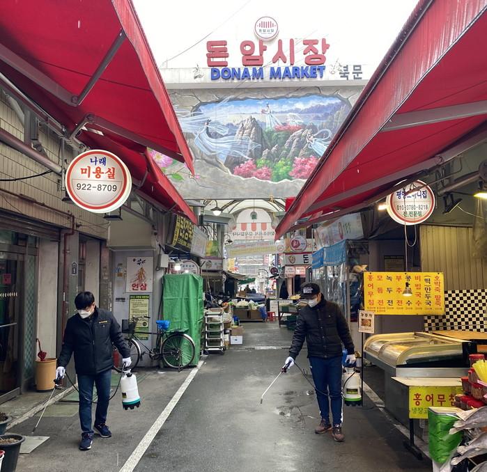 서울 성북구가 12~13일 양일간 코로나19 감염증 확산을 방지하고 주민들이 마음놓고 시장을 방문할 수 있도록 지역 소재 7개 시장 351개 점포를 대상으로 방역소독을 했다. 사진은 12일 돈암시장에서 전문방역업체가 소독을 하는 모습. (사진제공=성북구청)