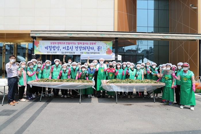 서울 마포구새마을부녀회는 9일 '여름 김치 나누기' 행사를 열고 열무김치·불고기를 만들어 지역내 노인들에게 전달했다. 사진은 행사에 참여한 유동균 구청장(가운데)과 부녀회 회원들이 기념촬영을 하는 모습. (사진제공=마포구청)