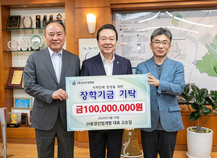 10일 (주)동양산업개발이 서울 강서구장학회에 지역 인재 양성을 위한 장학기금 1억원을 기탁했다. 이날 구청장실에서 진행된 기탁식에는 노현송 구청장을 비롯해 고순길 대표, 송진수 장학회 이사장 등이 참석했다. 사진은 노 구청장(가운데)과 관계자들의 기념촬영 모습. (사진제공=강서구청)