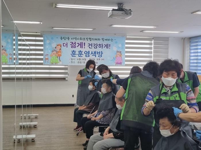 인천 동구 송림1동 지역사회보장협의체는 28일 지역내 65세 이상 노인을 대상으로 '훈훈염색방'을 운영해 염색 봉사활동을 펼쳤다. 사진은 이날 협의체 위원들이 대상 노인들에게 염색약을 발라주고 있는 모습. (사진제공=인천 동구청)