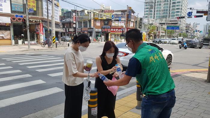 경기 구리시 수택1동 새마을지도자협의회는 오는 29일까지 매주 토·일요일 오후 2시부터 1시간 동안 시민들에게 '무더위탈출 생수나눔운동'으로 500㎖ 얼린 생수를 나누는 봉사활동을 실시한다. 사진은 최근 수택동 백병원사거리에서 폭염속 시민들에게 얼린 생수를 전달하고 있는 모습. (사진제공=구리시청)