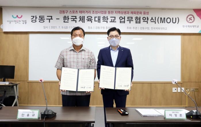 서울 강동구가 최근 한국체육대학교와 지역상생 및 체육문화 융성을 위한 업무협약을 체결했다. 양 기관은 협약을 통해 보유 자원과 전문성을 바탕으로 한 관련 사업 분야 육성과 활력있는 대학가 조성 등의 상호협력 체계를 구축했다. 사진은 협약식에서 이정훈 구청장(오른쪽)이 관계자와 기념촬영을 하는 모습. (사진제공=강동구청)