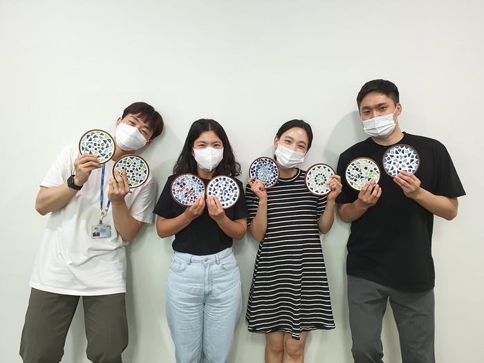 서울 강동구가 지역내 기업의 후원을 받아 어려운 이웃을 지원하는 ‘행복한 여름나기 더 나눔’ 활동을 전개하고 있다. 삼성물산은 중복을 맞아 여름철 노인들의 기운을 북돋아줄 간편 조리식 수삼갈비탕과 영양오리백숙 120세트를 기탁했고, 여기에 직원들이 직접 만든 ‘타일 코스터’를 더해 21일 암사1동과 천호2동 주민센터에서 취약계층 노인들에게 전달했다. 사진은 삼성물산 직원들이 타일코스터를 들고 기념촬영을 하는 모습. (사진제공=강동구청)