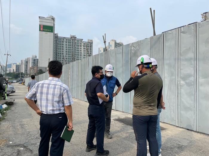 경기 의정부시는 최근 최근 장암생활권1구역 재개발사업지구내 건축물 철거 현장 안전시설물 파손 사고 발생과 관련해 긴급안전점검을 실시해 외부 비계 구조 적정성 검토 및 현장에 내재된 위험 요소 등을 집중 확인했다. 사진은 관계자들이 긴급안전점검을 하고 있는 모습. (사진제공=의정부시청)