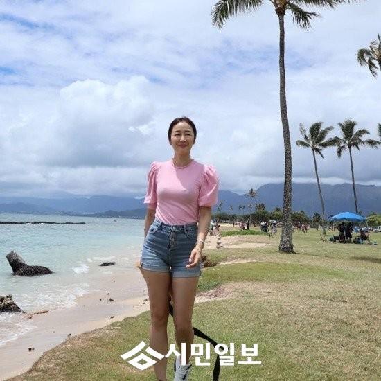 공개된 사진 속 김경화는 아름다운 자연을 배경으로 밀착 티셔츠에 핫팬츠를 입고 있다.