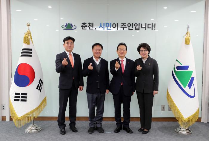 정순균 서울 강남구청장이 최근 강원 춘천시청 2층 로비에서 열린 ‘강남구·춘천시 자매결연 협약식’에서 이재수 춘천시장과 함께 협약서에 서명한 후 자매결연을 맺었다. 구는 앞으로 춘천시와 우수 행정시책에 대한 정보와 경험을 공유하고, 각 분야에서 상호 우호 협력관계를 구축할 계획이다. 사진은 협약 후 기념촬영을 하고 있는 모습. (사진제공=강남구청)