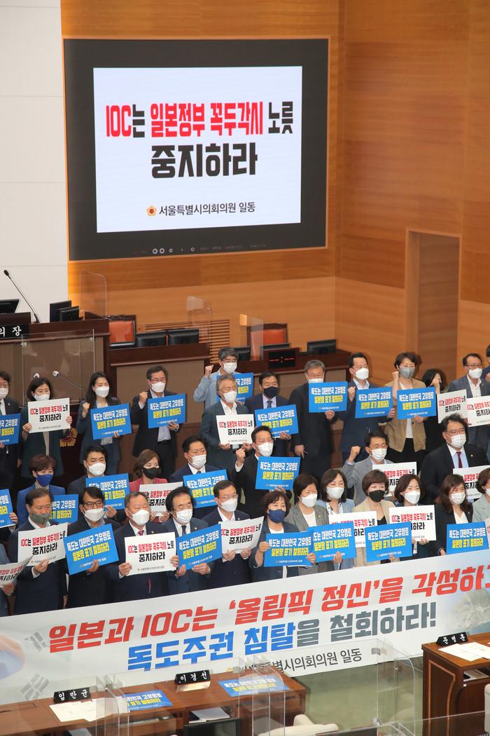 15일 오후 서울시의회 정례회 본회의를 마친 의원들이 도쿄올림픽조직위 홈페이지 독도 표기와 관련해 규탄대회를 열고 있다. 서울시의회는 이날 일본의 독도 영유권 침탈행위 규탄 결의안을 채택했다.