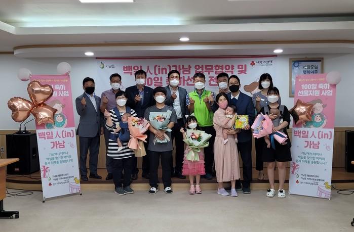 경기 여주시 가남읍 지역사회보장협의체는 지난 17일 올해 1월1일 이후 지역내에서 출생신고를 한 아이 중 백일을 맞이한 아이에게 꽃다발과 상품권(10만원) 등을 지원하는 '백일人(in)가남' 백일 축하 행사를 진행했다. 사진은 이날 백일人(in)가남 행사에 참여한 아기와 가족들이 기념촬영을 하는 모습. (사진제공=여주시청)