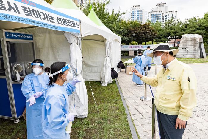 김선갑 서울 광진구청장은 지난 20일 광진광장 찾아가는 선별진료소를 찾아 의료진과 근무자들의 애로사항을 듣고 격려했다. 광진광장 찾아가는 선별진료소는 오는 31일까지 운영되며, 운영시간은 평일·토요일 오전 10시~오후 6시이며, 오후 1~2시는 소독시간으로 운영하지 않는다. 사진은 김 구청장(오른쪽)이 의료진과 대화를 하고 있는 모습. (사진제공=광진구청)