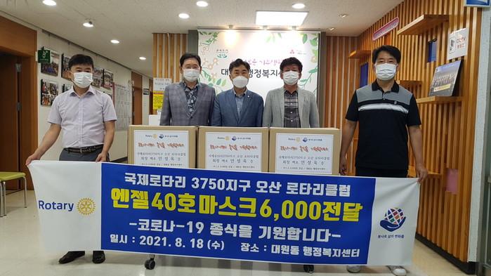 경기 오산시에 소재한 오산로타리클럽이 18일 지역내 저소득층을 위해 대원동 행정복지센터에 마스크 6000장을 기부했다. 사진은 관계자들이 기념촬영을 하고 있는 모습. (사진제공=오산시청)