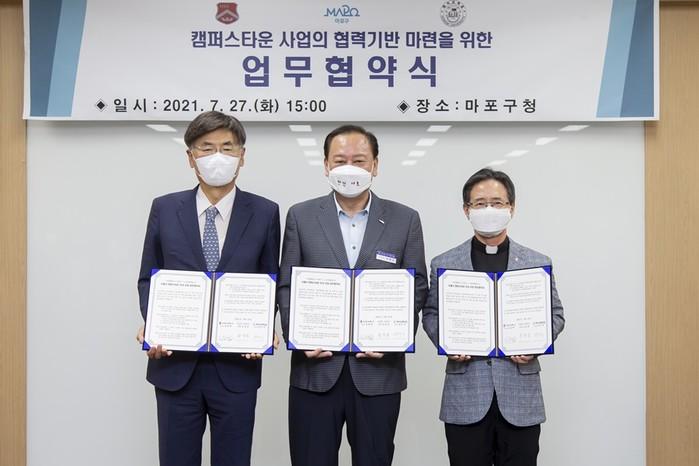 서울 마포구는 27일 홍익대·서강대와 캠퍼스타운 공모사업 협력기반 마련을 위한 업무협약식을 진행했다. 협약의 주요 내용은 캠퍼스타운 사업 공모선정을 위한 상호협력과 청년 창업 육성을 통한 일자리 창출 등이다. 사진은 협약식에서 유동균 구청장(가운데)이 관계자들과 기념촬영을 하는 모습. (사진제공=마포구청)