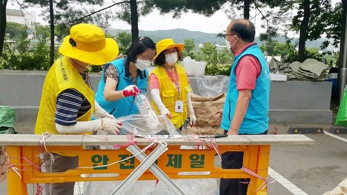 경기 수원시 장안구 정자3동은 최근 천천 신명아파트, 화서역 위너스파크아파트, 연꽃마을벽산아파트 등 현장을 방문해 근무 중인 자원재활용 도우미들을 격려하고, 쿨토시·쿨스카프·얼음생수 등을 전달했다. 사진은 동 관계자들이 현장을 방문해 자원재활용 도우미들과 대화를 나누고 있는 모습. (사진제공=장안구청)