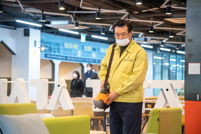 성장현 서울 용산구청장이 최근 코로나19 집단감염이 심각해지고 있는 가운데 지난 10일 용산전자 상상가를 찾아 신설된 방역시설을 점검하고 방역작업에 참여했다. 사진은 성 구청장이 상상가 상상라운지를 소독하고 있는 모습. (사진제공=용산구청)