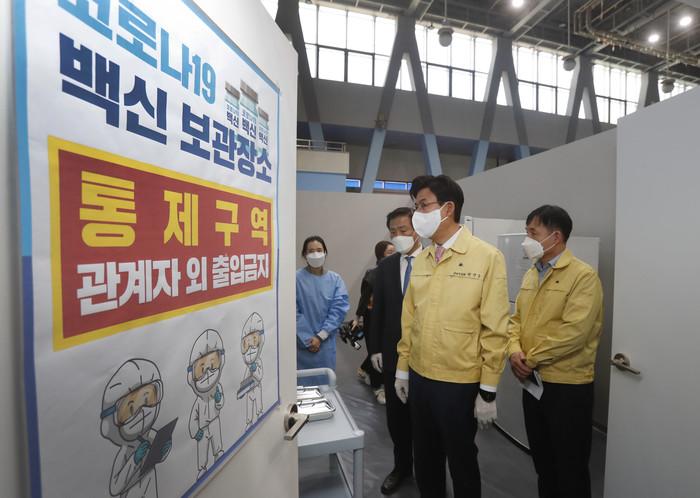 송파구는 최근 송파체육문화회관에 설치된 코로나19 예방접종센터에서 오는 4월1일부터 시행되는 75세 이상 노인을 대상 코로나19 백신접종을 위한 예진·접종·이상반응 모니터링 등 모의훈련을 실시했다. 사진은 모의훈련을 참관하고 있는 박성수 구청장(가운데)의 모습. (사진제공=송파구청)