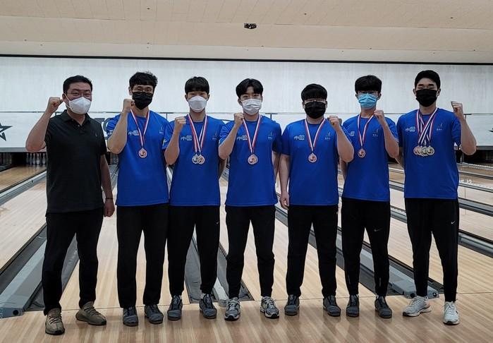경기 광주시청 볼링팀이 최근 열린 ‘제23회 한국실업볼링연맹회장기 전국실업볼링대회’에서 금메달 2개, 은메달 1개, 동메달 2개 등 총 5개 메달을 휩쓸었다. 사진은 목에 메달을 건 광주시청 볼링팀 선수단이 기념촬영을 하고 있는 모습. (사진제공=광주시청)