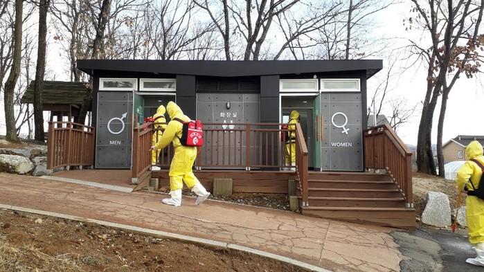 경기 연천군은 25일 코로나19(우한폐렴) 확산에 따라 이를 예방하기 위해 일반인의 왕래가 잦은 공원내 어린이 놀이시설, 운동기구, 공중화장실 등에 대한 일제 방역소독을 실시했다. 사진은 소독작업을 하고 있는 모습. (사진제공=연천군청)