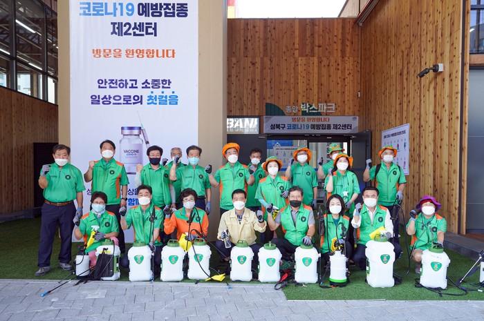 이승로 서울 성북구청장이 27일 전국 자율방재단연합회·성북구 자율방재단연합회원과 함께 종암동에 위치한 코로나19 예방접종 제2센터에서 합동방역활동을 펼쳤다. 사진은 이날 이 구청장(앞줄 가운데)이 봉사자들과 기념촬영을 하고 있는 모습.(사진제공=성북구청)