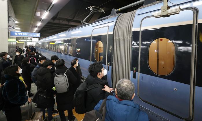 한국철도(코레일)가 중앙선 원주∼제천 구간 복선전철 개통에 맞춰 5일부터 청량리∼안동 간에 신형 고속열차 'KTX-이음' 운행을 시작했다. 국민공모로 이름 지어진 'KTX-이음'은 국내 기술로 탄생한 최초의 동력 분산식 고속차량이다. 5일 서울 청량리역에 정차한 'KTX-이음' 앞에서 시민들이 탑승하기 위해 기다리고 있다.
