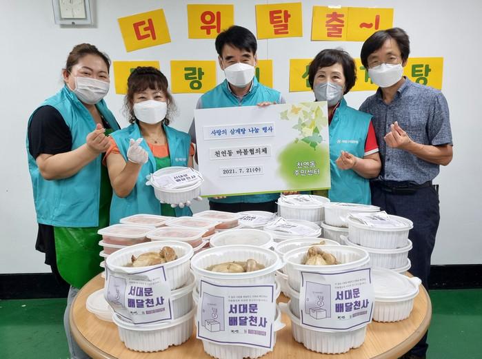 서울 서대문구 천연동 마봄협의체는 최근 폭염 속에서도 지역내 취약계층 홀몸노인 30명에게 삼계탕을 직접 조리해 전달하는 뜻깊은 사업을 진행했다. 협의체 위원들은 삼계탕을 비대면으로 전달한 뒤 전화로 안부를 확인했다. 사진은 이날 봉사자들이 기념촬영을 하는 모습. (사진제공=서대문구청)