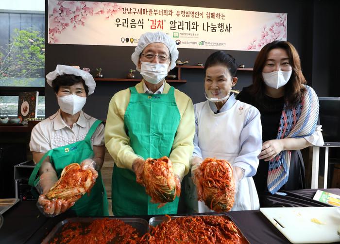 서울 강남구가 7일 강남구 새마을부녀회와 유정임 김치명인과 함께하는 김치담그기·나눔 행사를 개최했다. 이날 현장에서 직접 만든 김치는 각 동주민센터를 통해 취약계층 100가구에 각 3kg씩 전달된다. 사진은 행사에 함께한 정순균 구청장(왼쪽 두 번째)이 기념촬영을 하는 모습. (사진제공=강남구청)
