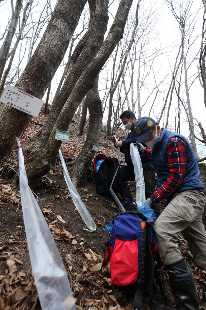 우수를 사흘 앞둔 15일 강원 강릉시 왕산면 목계리의 한 야산에서 주민이 고로쇠 수액을 채취하고 있다.