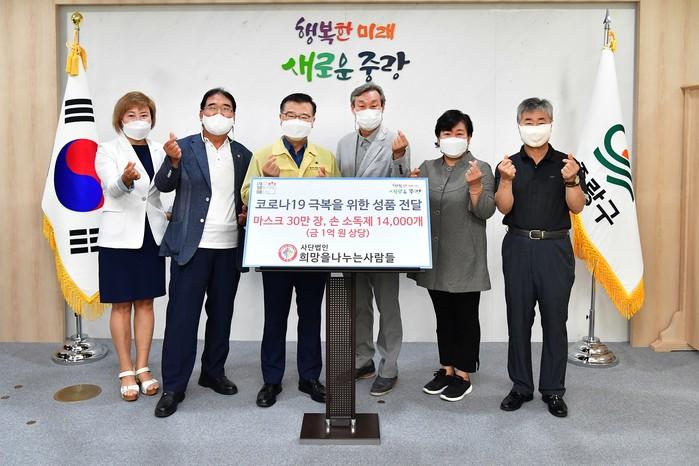 서울 중랑구는 26일 (사)희망을나누는사람들로부터 코로나로 어려움을 겪는 소상공인들을 위한 방역용품(덴탈마스크 30만장·손소독제 1만4000개)을 전달받았다. 이 물품은 지역내 다중이용업소 6679곳에 전달될 예정이다. 사진은 전달식에서 류경기 구청장(왼쪽에서 세 번째)과 관계자들이 기념촬영을 하는 모습. (사진제공=중랑구청)