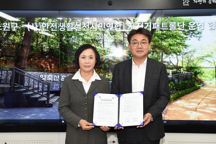 서울 노원구가 구민들이 자전거를 이용하는 데 따른 편의 증진을 위해 최근 구청장실에서 안전생활실천시민연합과 함께 자전거패트롤단 운영 협약을 체결했다. 사진은 오승록 구청장(오른쪽)과 안전생활실천시민연합 관계자가 협약 체결 후 기념촬영을 하는 모습. (사진제공=노원구청)