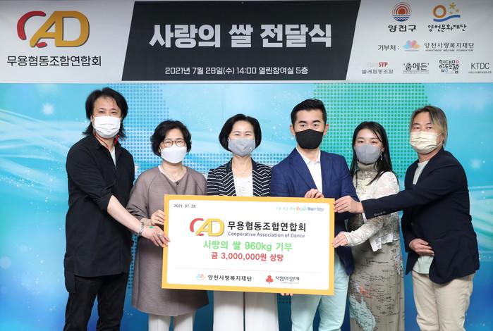 서울 양천구는 28일 무용협동조합 연합회로부터 취약계층 지원을 위힌 쌀 960kg(2600만원 상당)을 전달받았다. 양천사랑복지재단을 통해 기부한 쌀은 지역내 취약계층을 위해 쓰일 예정이다. 사진은 전달식에서 김수영 구청장(왼쪽에서 세 번째)이 관계자들과 기념촬영을 하는 모습. (사진제공=양천구청)