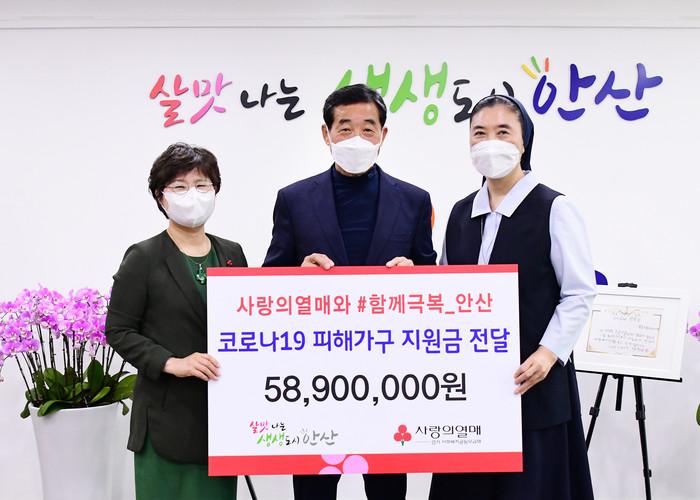 윤화섭 경기 안산시장(가운데)이 6일 시장실에서 열린 코로나19 피해가구 지원금 전달식에서 강성숙 안산시지역사회보장협의체 민간위원장(오른쪽), 최은숙 경기도사회복지공동모금회 사무처장과 함께 기념촬영을 하고 있다. (사진제공=안성시청)