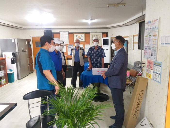 경기 동두천시 보산동 행정복지센터는 최근 보산동 지역내 경로당 8곳을 방문해 코로나19 방역수칙과 출입규정 설명 및 안전신분증 제도를 홍보했다. 사진은 이날 강성진 동장(오른쪽)이 지역내 경로당을 방문해 동에서 준비한 떡을 전달하고 지역내 경로당을 방문해 노인들과 대화를 하고 있는 모습. (사진제공=동두천시청)