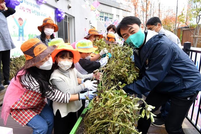 경기 하남시는 최근 어린이집 및 기관에 분양된 상자텃밭 중 한 곳인 샛별어린이집에서 지난 4월부터 원아들이 직접 기른 '땅콩 수확 체험 행사'를 개최했다. 사진은 이날 행사에 참여한 김상호 시장(오른쪽)이 원아들과 함께 상자텃밭에서 땅콩을 수확하고 있는 모습. (사진제공=하남시청)