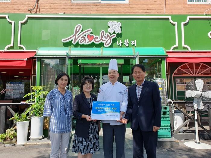 경기 양주시 광사동 소재 나블리 베이커리카페는 최근 양주2동 행정복지센터를 방문해 50만원 상당의 베이커리상품권(1만원권 50매)을 기탁했다. 기탁된 상품권은 지역내 어려운 이웃들에게 전달될 예정이다. 사진은 기념촬영을 하는 모습. (사진제공=양주시청)