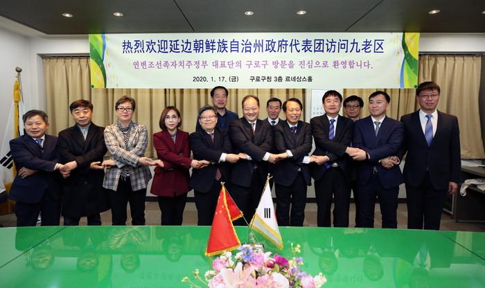 최근 중국 연변조선족자치주 대표단이 서울 구로구를 방문, 양 도시 간의 교류 협력을 강화하고 우수한 행정 사례를 공유하고, 양 도시간 공무원 파견 협약도 체결했다. 사진은 기념촬영을 하고 있는 구로구 관계자들과 대표단의 모습. (사진제공=구로구청)