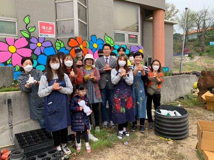 경기 포천시가 올해 평생학습동아리 발굴 지원 사업의 '지역 가꾸기' 프로젝트의 일환으로 최근 시 평생학습 동아리 청소년들과 함께 우리동네 학습공간 신북작은 도서관에서 벽화 그리기와 화단 가꾸기를 진행했다. 사진은 참여 학생들이 기념촬영하는 모습. (사진제공=포천시청)