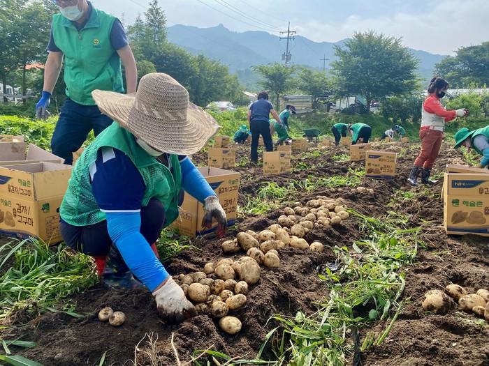 경기 포천시 내촌면 남녀새마을지도자협의회는 최근 '사랑의 감자 나눔 행사'를 진행했다. 참여자들은 내촌면 내4리 밭 300여평에 직접 심고 관리한 감자 120상자를 수확해 취약계층 가구에 직접 전달했다. 사진은 이날 봉사자들이 감자를 수확하고 있는 모습. (사진제공=포천시청)