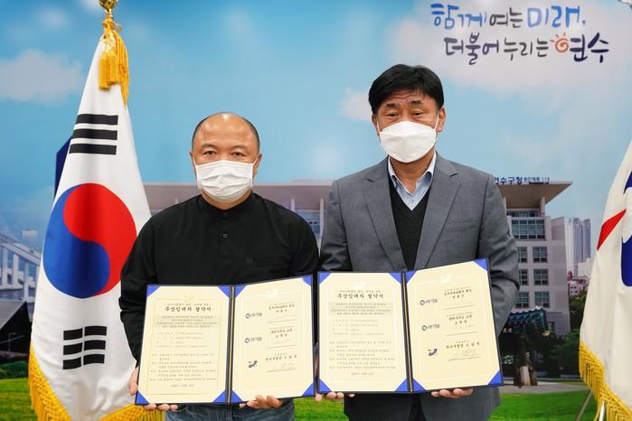 인천 연수구가 12일 ‘아이사랑꿈터 1호점’ 설치·운영을 위해 연수서해그랑블1단지 입주자대표회와 무상임대 협약을 체결했다. 아이사랑꿈터는 돌봄공간 제공과 공동육아 활동 지원을 위한 인천형 공동육아시설로 거주지 근처의 공공기관·폐원가정어린이집 등에 조성된다. 사진은 협약식에서 고남석 구청장(오른쪽 두 번째)과 관계자들이 기념촬영을 하는 모습. (사진제공=연수구청)