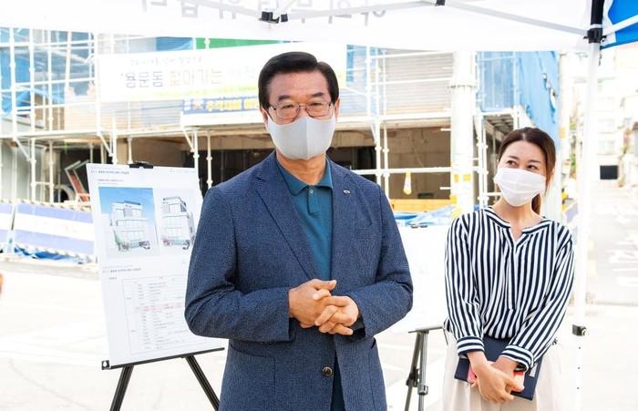 성장현 서울 용산구청장이 지난 28일 오는 9월 준공 예정인 용문동 주민커뮤니티센터 신축 공사현장을 찾아 시설을 점검했다. 커뮤니티센터는 지하 1층~지상 4층, 연면적 524.61㎡ 규모로 내부에는 다목적실·라운지·작은 도서관 등을 갖췄다. 사진은 공사현장에서 성장현 구청장(왼쪽)이 주민들과 이야기를 나누고 있는 모습. (사진제공=용산구청)