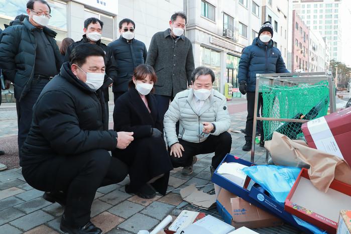 경기 남양주시가 무단투기 문제를 해결하기 위해 ‘싹쓰리 프로젝트’를 진행 중인 가운데 지난 16일 조광한 시장이 별내동 에코패밀리와 함께 별내 평화마을 일원 무단투기 현장을 직접 점검했다. 사진은 조 시장(앞줄 오른쪽)이 이도재 남양주시의회 부의장과 함께 무단투기 현장을 점검하고 있는 모습. (사진제공=남양주시청)