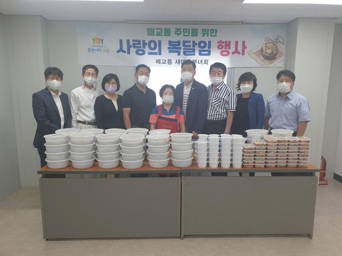 경기 수원시 팔달구 매교동 새마을부녀회는 6일, '사랑의 복달임' 행사를 진행해 홀몸노인이나 혼자 거주하는 장애인 등 소외계층 60가구에 삼계탕을 만들어 전달했다. 사진은 봉사자 및 관계자들이 기념촬영을 하는 모습. (사진제공=팔달구청)