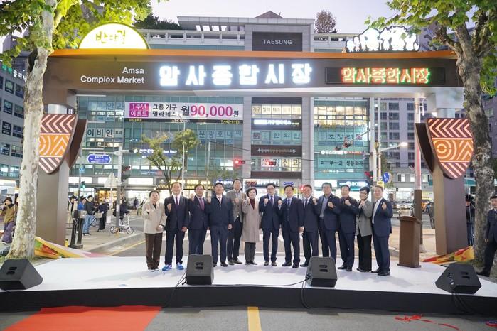 서울 강동구가 침체된 전통시장에 활력을 불어넣고 암사종합시장을 홍보하기 위해 상징조형물을 설치하고 최근 준공식을 개최했다. 사진은 준공식 후 기념촬영을 하고 있는 이정훈 구청장(가운데)의 모습. (사진제공=강동구청)