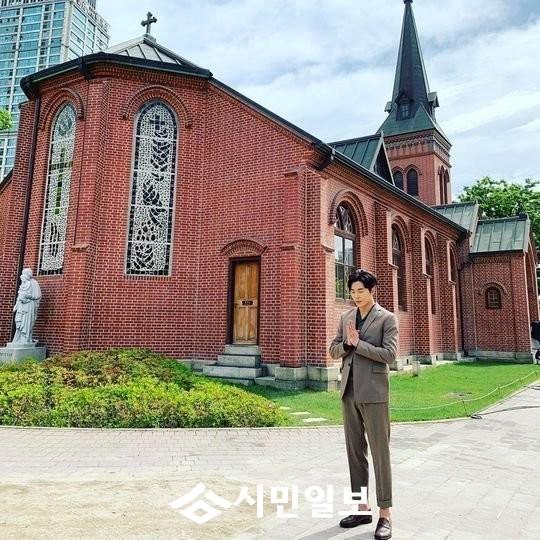 공개된 사진 속에는 성당 앞에서 기도를 하고 있는 김재욱의 모습이 담겨있다.