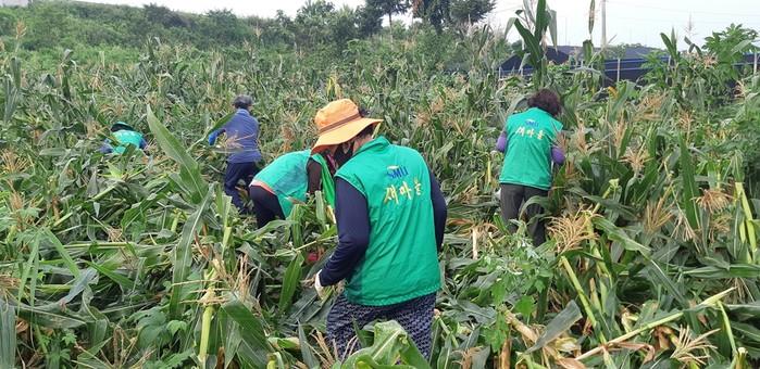 경기 포천시 가산면 남·여 새마을 지도자 협의회는 최근 더불어 사는 가산면 만들기의 일환으로 지역내 불우이웃을 위한 ‘사랑의 농산물 나눔’을 실시해 올 봄부터 텃밭에서 재배한 옥수수를 수확했다. 사진은 이날 봉사자들이 옥수수를 수확하고 있는 모습. (사진제공=포천시청)