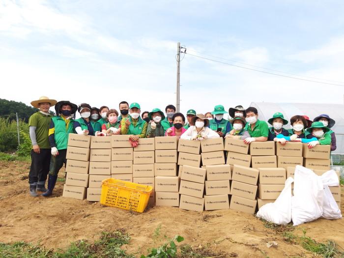 경기 안산시 단원구 와동 새마을회는 최근 회원들이 그동안 직접 키운 감자 10kg 100상자를 수확해 지역내 경로당 9곳·지역아동센터 8곳 등 지역주민과 기관에 전달했다. 사진은 이날 봉사자들이 감자를 수확한 뒤 기념촬영을 하고 있는 모습. (사진제공=안산시청)