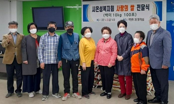 서울 서대문구 홍제3동 주민센터는 사단법인 시온성복지회로부터 최근 저소득 노인가구를 위한 사랑의 쌀 10kg 100포를 전달받았다. 사진은 전달식에서 관계자들이 기념촬영을 하고 있는 모습. (사진제공=서대문구청)