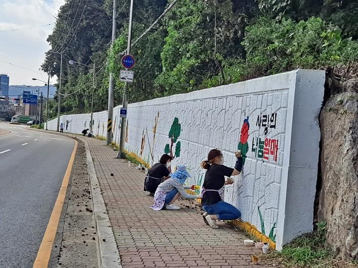경기 광주시 송정동 행정복지센터는 최근 송정동 22-11 일원의 120여m에 이르는 칙칙한 회색 콘크리트 옹벽에 벽화를 완성했다. 사진은 사랑의 나눔 열매 봉사단 봉사자들이 옹벽에 벽화를 그리고 있는 모습. (사진제공=광주시청)