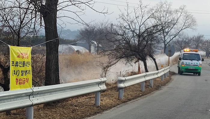 25일 오전 강원 춘천시 방역차량이 최근 야생조류에서 고병원성 조류인플루엔자(AI)가 발생한 동내면 하천에서 방역을 하고 있다.