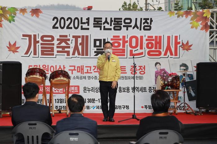 서울 금천구가 최근 코로나19 장기화로 지친 지역주민에게 힐링의 시간을 제공하고, 침체된 시장분위기를 끌어올리기 위해 ‘독산동우시장 가을축제’를 개최했다. 사진은 축제에서 유성훈 구청장이 주민들에게 인사말을 하고 있는 모습. (사진제공=금천구청)